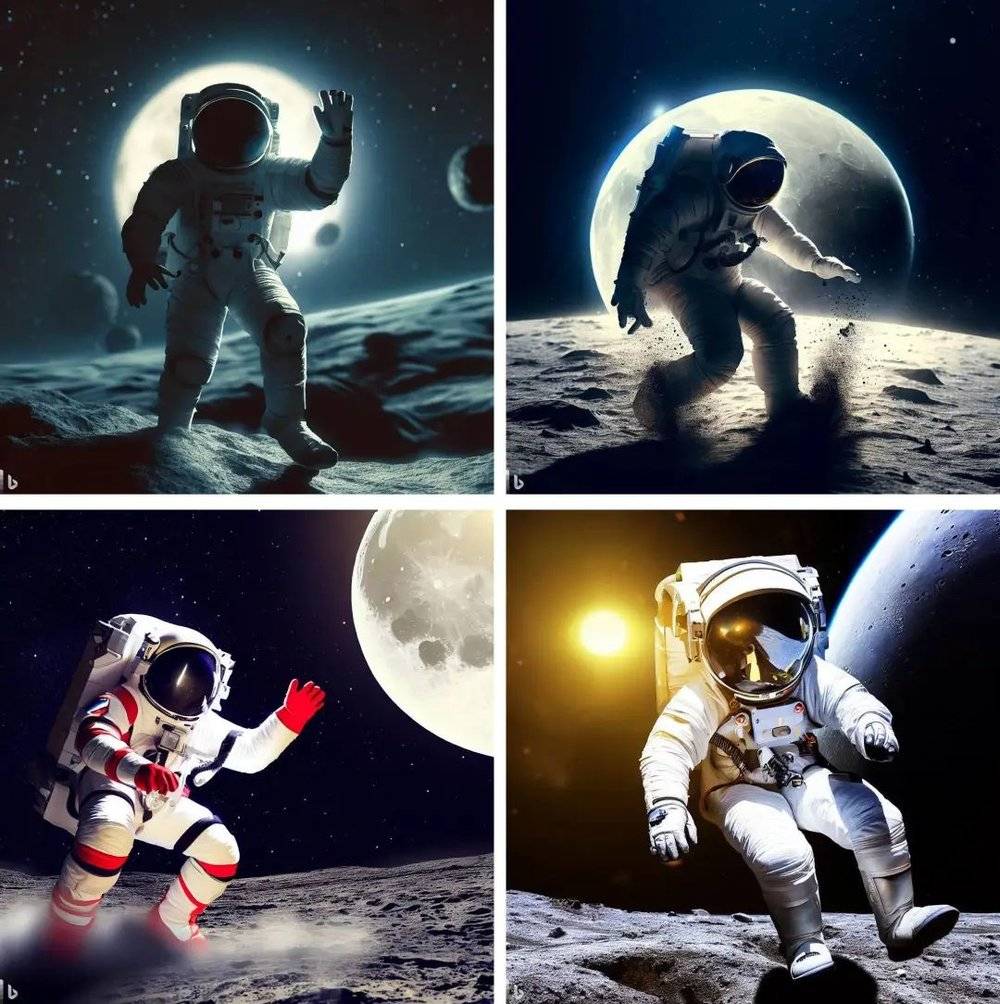 我使用中文让它创作了几张宇航员登陆月球的图片,不知你更喜欢哪一张。