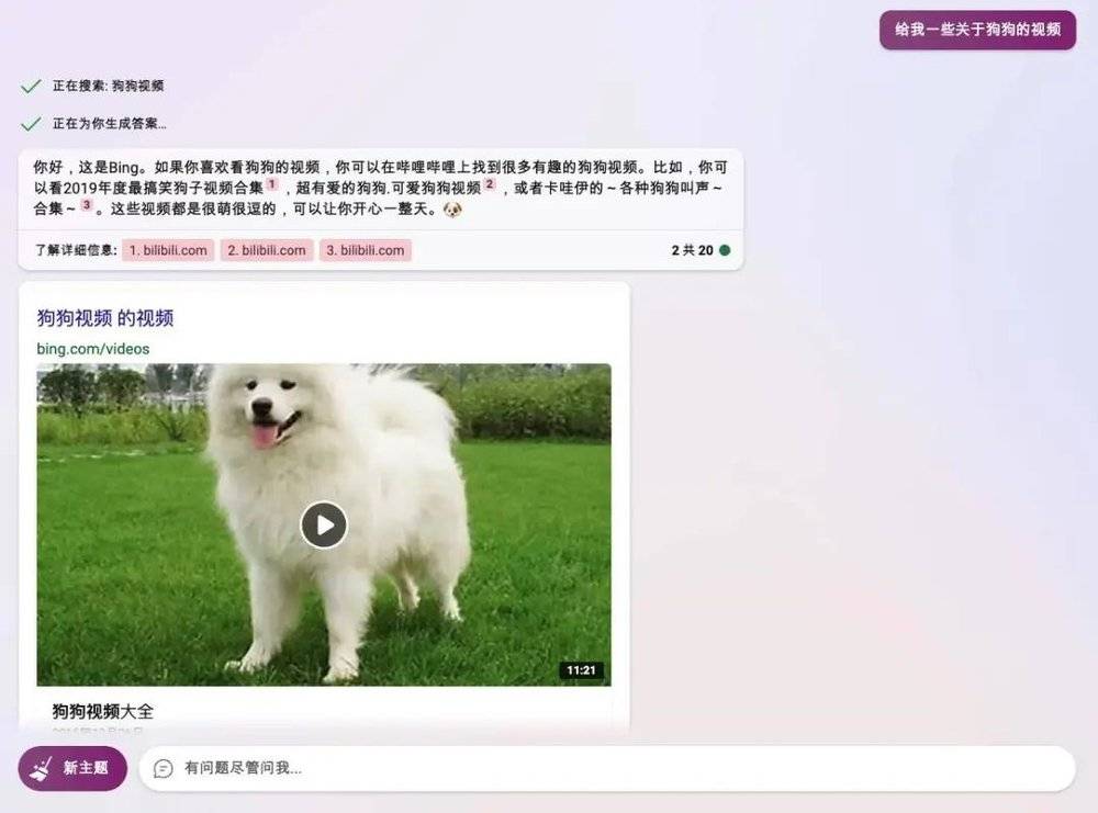 比如,在我询问它关于狗狗的视频时,它不仅给我提供了视频链接,还直接给出了视频,点击就可直接播放。