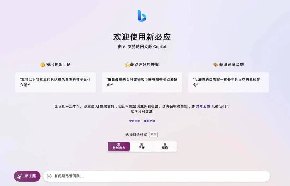全新的 Bing Chat 提供了三种不同的对话样式,更有创造力(富有想象力)、更平衡(丰富友好)、更精确(直截了当)。