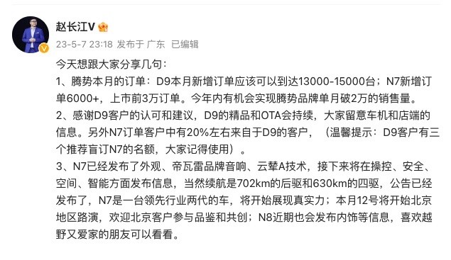 【TechWeb】5月8日消息,腾势销售事业部总经理赵长江近日在国内社交媒体发文称,D9本月新增订单应该可以到达13000-15000台;N7新增订单6000+,上市前3万订单。今年内有机会实现腾势品牌单月破2万的销售量。