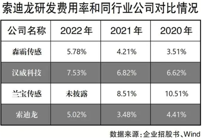 除了研发规模较小,研发费用率也低于同业公司均值。招股书显示,索迪龙列举了森霸传感、汉威科技和兰宝传感等3家可比公司。